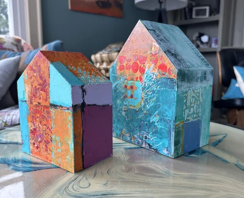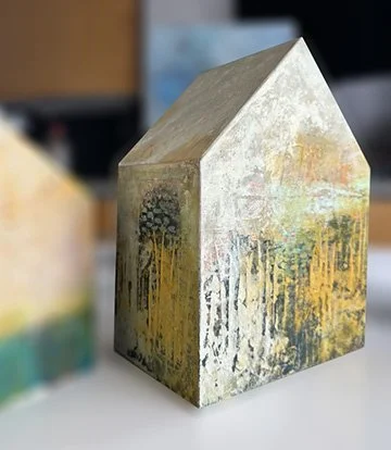 The sculptural forms and paintings are oil and cold wax on custom made birch panels or sculptural forms. The series was designed to represent my need to be connected to family and especially to my own home. The layers in each work, which are developed over time are like the many layers of our lives at home.This name had a personal meaning when I conceived of it but now after our confinement, and new way of living in the world, I think the work has a much more universal message.
