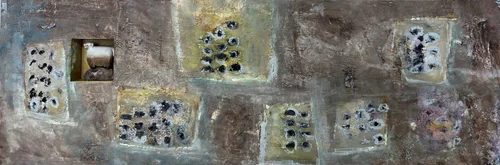 20 × 16 / Oil and cold wax mixed media and found ceramic tile on birch panel